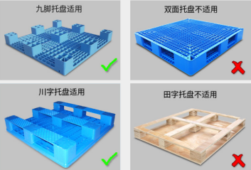 要盡可能選用國際標(biāo)準(zhǔn)的托盤規(guī)格,以便于托盤的交換和使用。一般的叉車都適用九腳托盤、川字托盤,并且九腳托盤和川字托盤的內(nèi)寬均需要大于貨叉的外寬。像田字托盤和雙面托盤并不適用所有的搬運(yùn)車。
