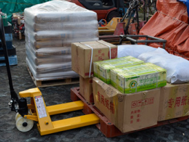 超市使用手動液壓搬運車向訂貨公司送貨